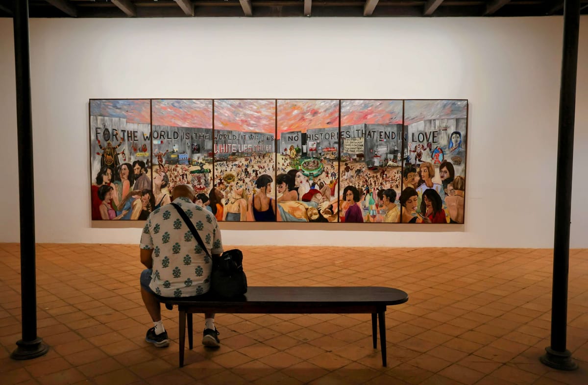 The Indian Garden with Unknown Flowers, 2025. A massive oil-on-linen triptych (549 x 305 cm). Ratheesh paints from the fractures of contemporary India. His work tracks how Brahminical patriarchy has taken political shape through religious communalism, and how ideology filters into daily life - deciding what's visible, what's acceptable, what gets erased. His figures are migrants, workers, mythic characters, ordinary people. All of them adapting, all carrying the weight of historical memory. The 2018 Kerala floods and the COVID-19 pandemic appear as backdrops, moments where infrastructure collapsed but human solidarity didn't. Courtesy of Galerie Mirchandani+Steinruecke.