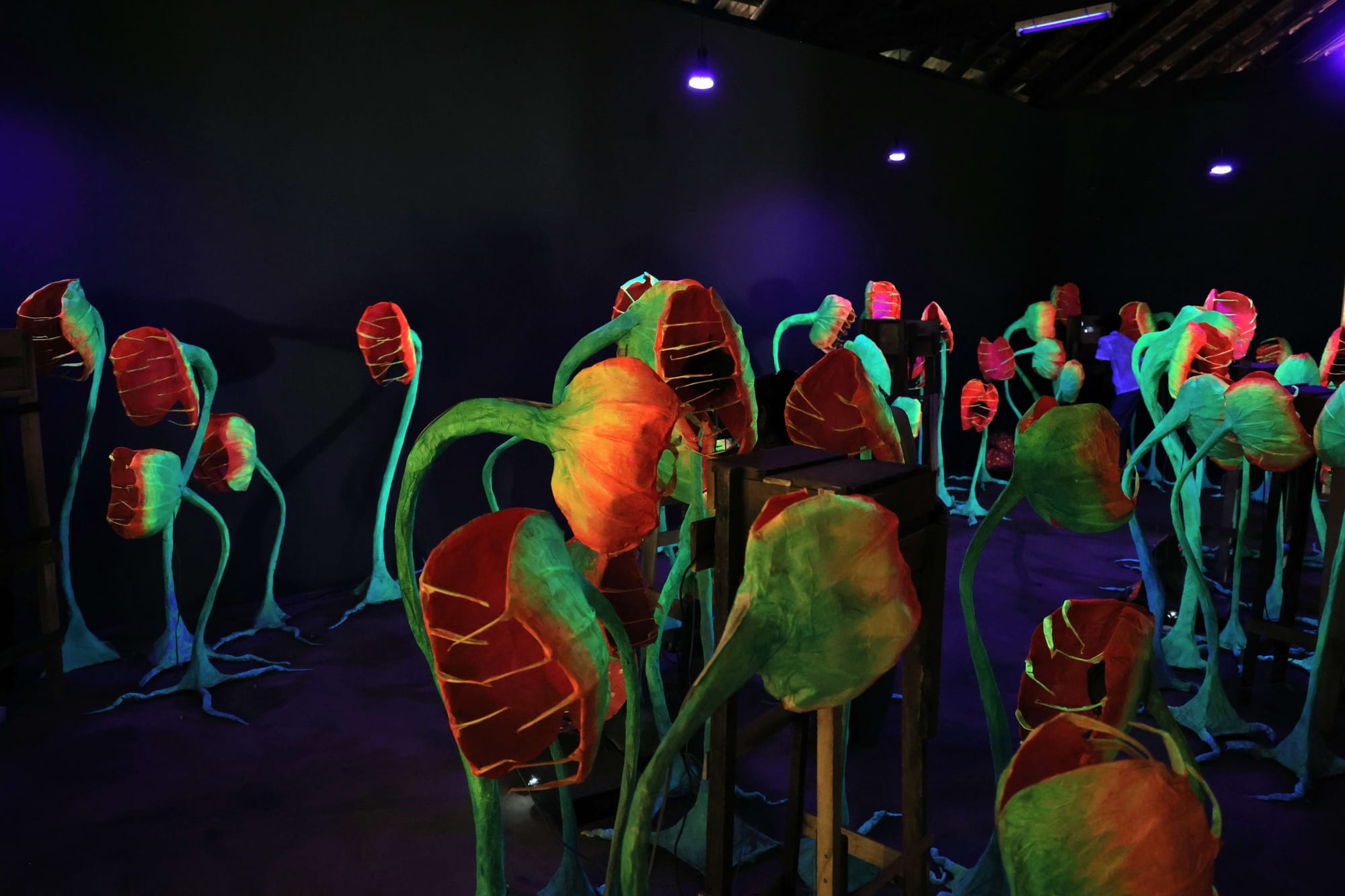 Imagine walking into a garden of carnivorous flowers with sharp white teeth, glowing under blue UV light. News reports about the ULFA (United Liberation Front of Assam) insurgency buzz from speakers - in Assamese, Hindi, and English - but the voices blur into noise. You can't quite make out the words. That's the point.