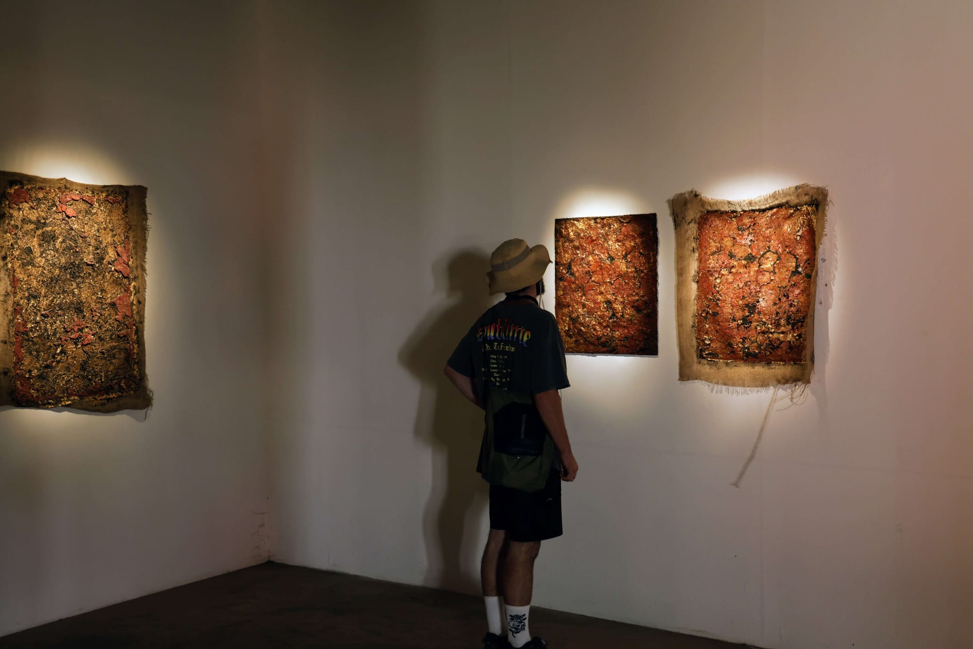 Her tar canvases in "Mimetics" (2025) look like earth charred under extreme heat. Each work begins from a silicon impression of another, creating a series that's connected but never linear - with gaps and additions that echo each other. Some canvases come alive with gold leaf and red pigment over the black tar.