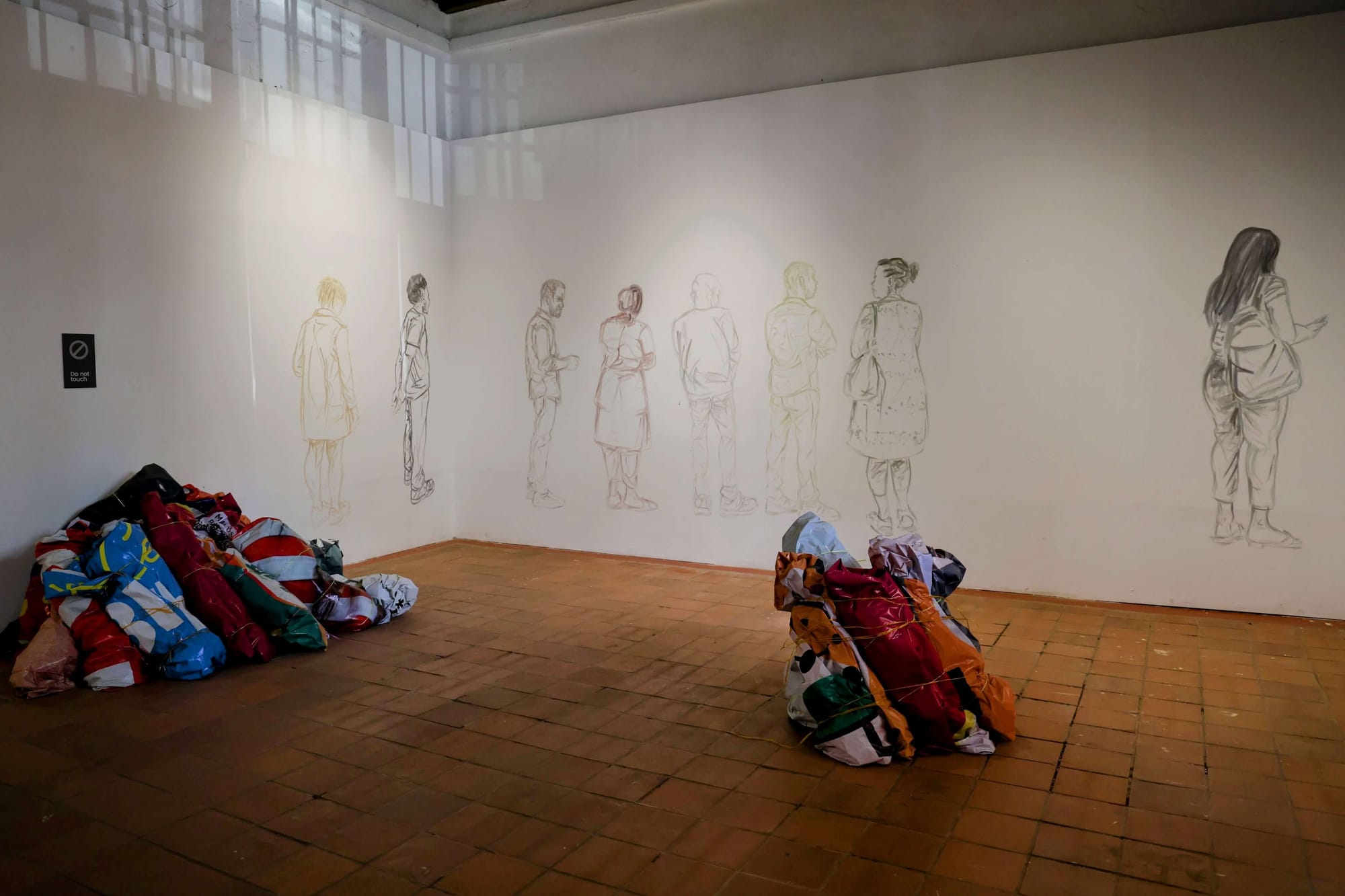 If I could travel back in time, I would build a shelter for my mother and help her run away. That's Tal Sasum, a student from Arunachal Pradesh, describing an artwork made of fabric, cardboard, and watercolour. In the next room, a Kenyan artist has drawn anonymous human figures directly onto the 330-year-old walls of a Dutch colonial building. One show is about a girl who was never given a choice. The other is about bodies that never stop moving. Both are at David Hall.