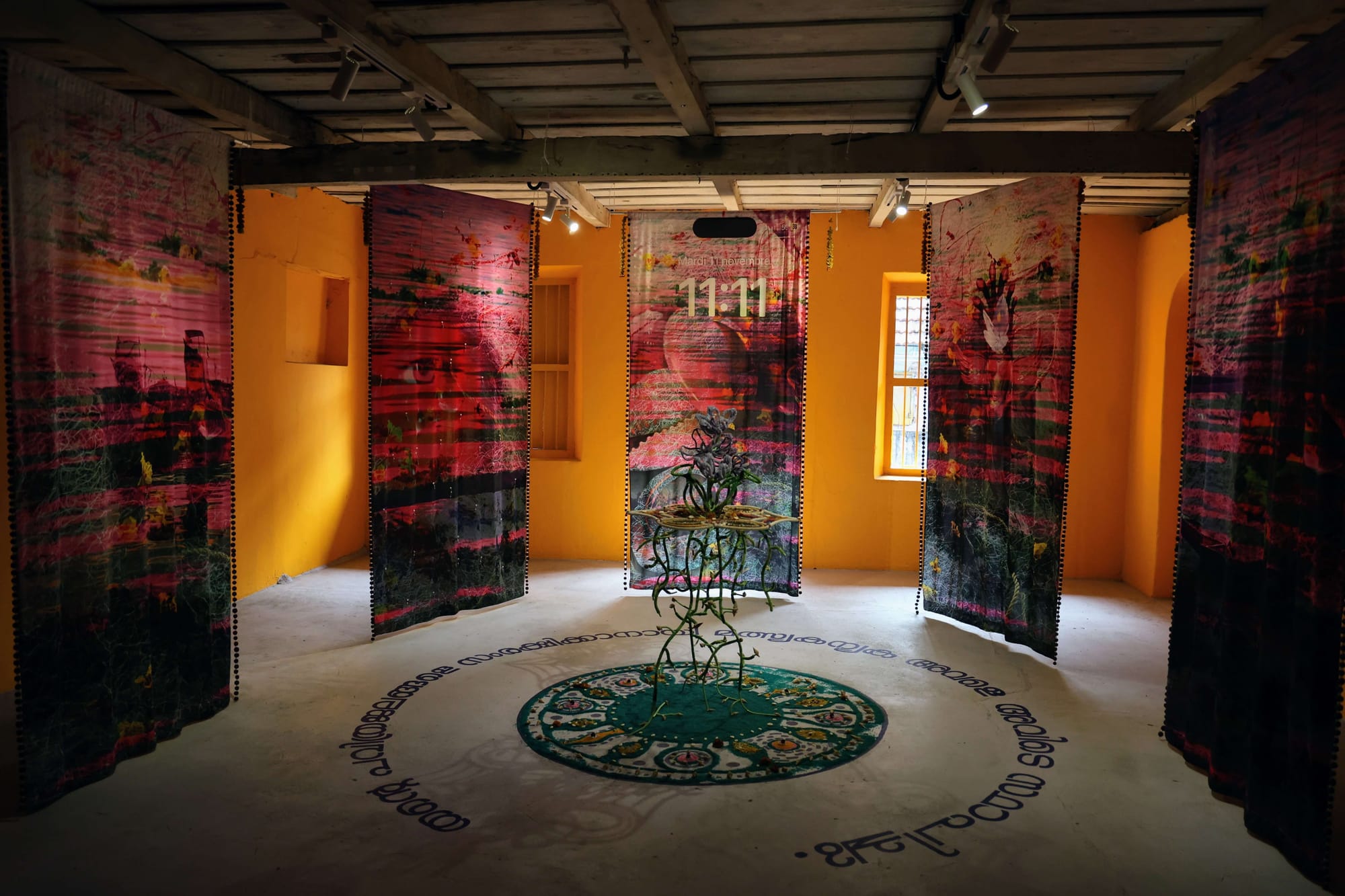 The venue also hosts Shivay La Multiple, an installation using metal, glass beads, seeds, and textile printing to trace the journey of the water hyacinth from Cameroon to India. The artist noticed the same violet carpet of flowers on the Koo River in Cameroon and in the waters around Fort Kochi — and asks what the appearance of these species is trying to tell us.
