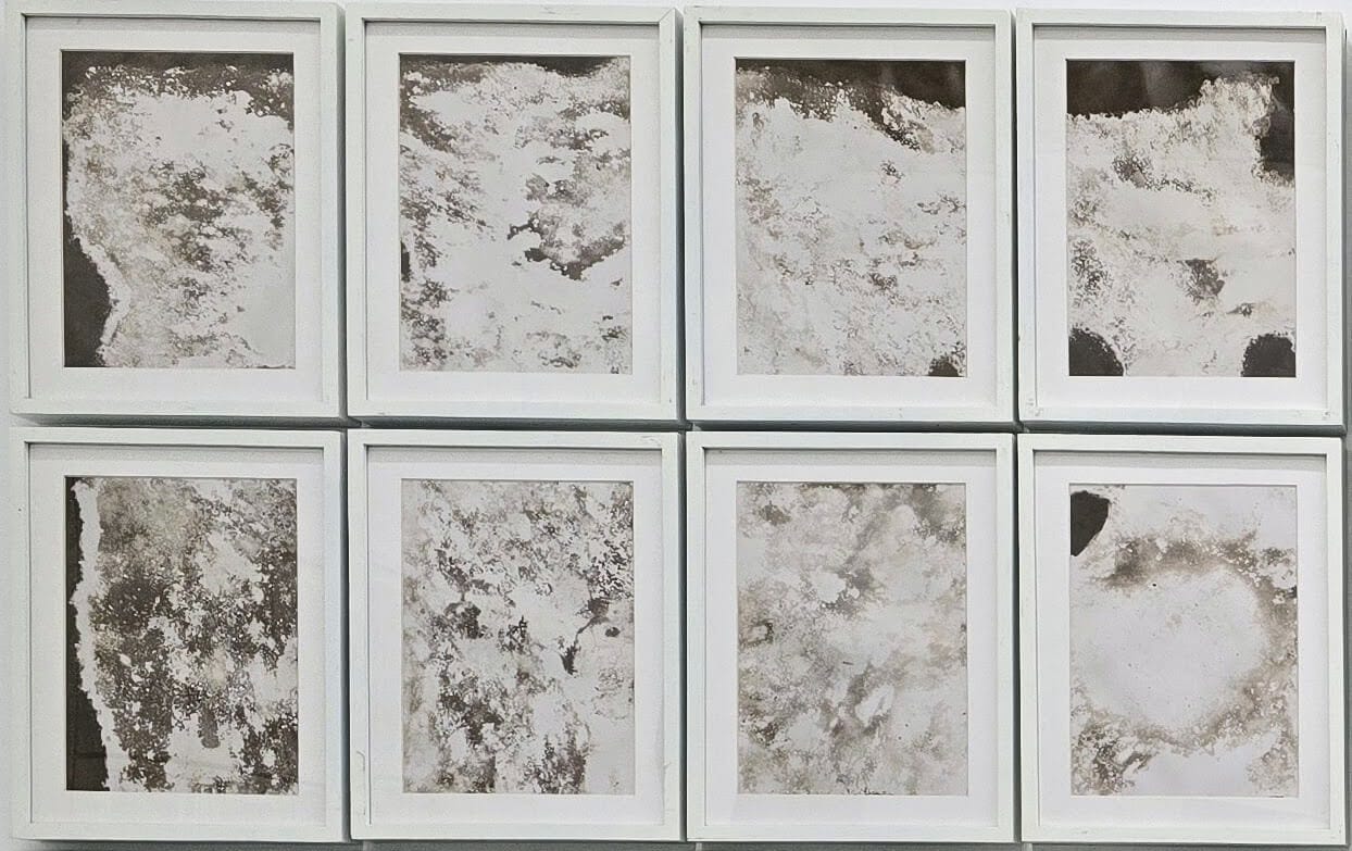 Chinese and Malayali cultures influenced each other in cuisine, martial arts, and language. David collects sand from ancient Chinese settlement sites - Sambranikodi, Sasthamkotta Lake, and Thangassery - and layers it onto photosensitive paper. He then exposes the paper to monsoon rains, producing abstract, non-representational images.