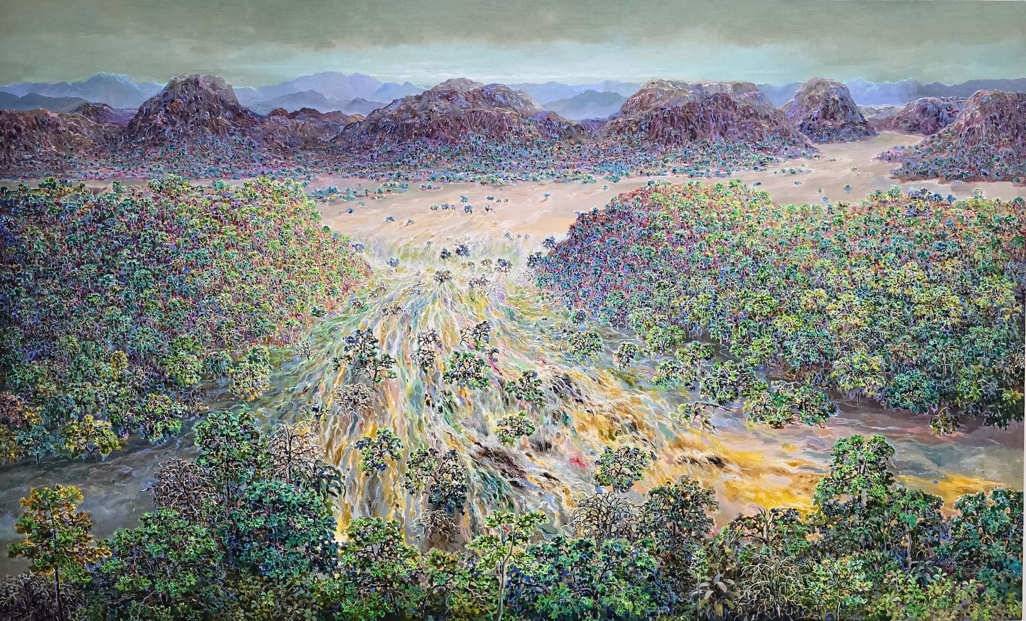 Umesh PK paints the natural world, but never tries to preserve a fixed image. He starts with something specific, then lets the work dissolve and transform through the process. Thick layers of pigment accumulate on canvas, creating a dynamic tension between what you can recognise and what slips into abstraction.