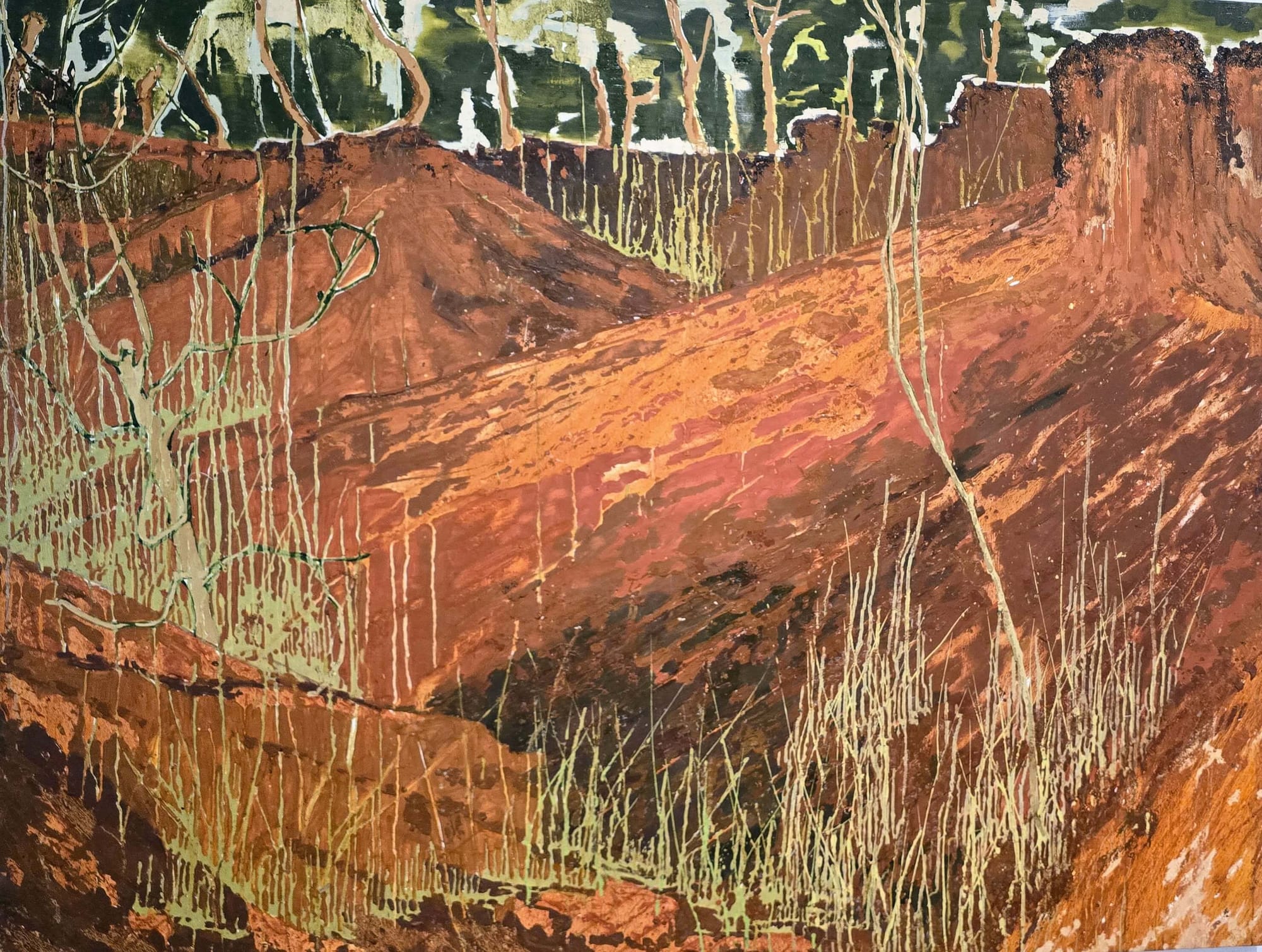 Oil on Canvas, Laterite soil and mud, Bamboo, coconut coir rope, Jute fabric, Binding wire, Tape, Zinc sheets, Graphite on paper, Ink on paper, Photographs, Collected objects from land, Etchings