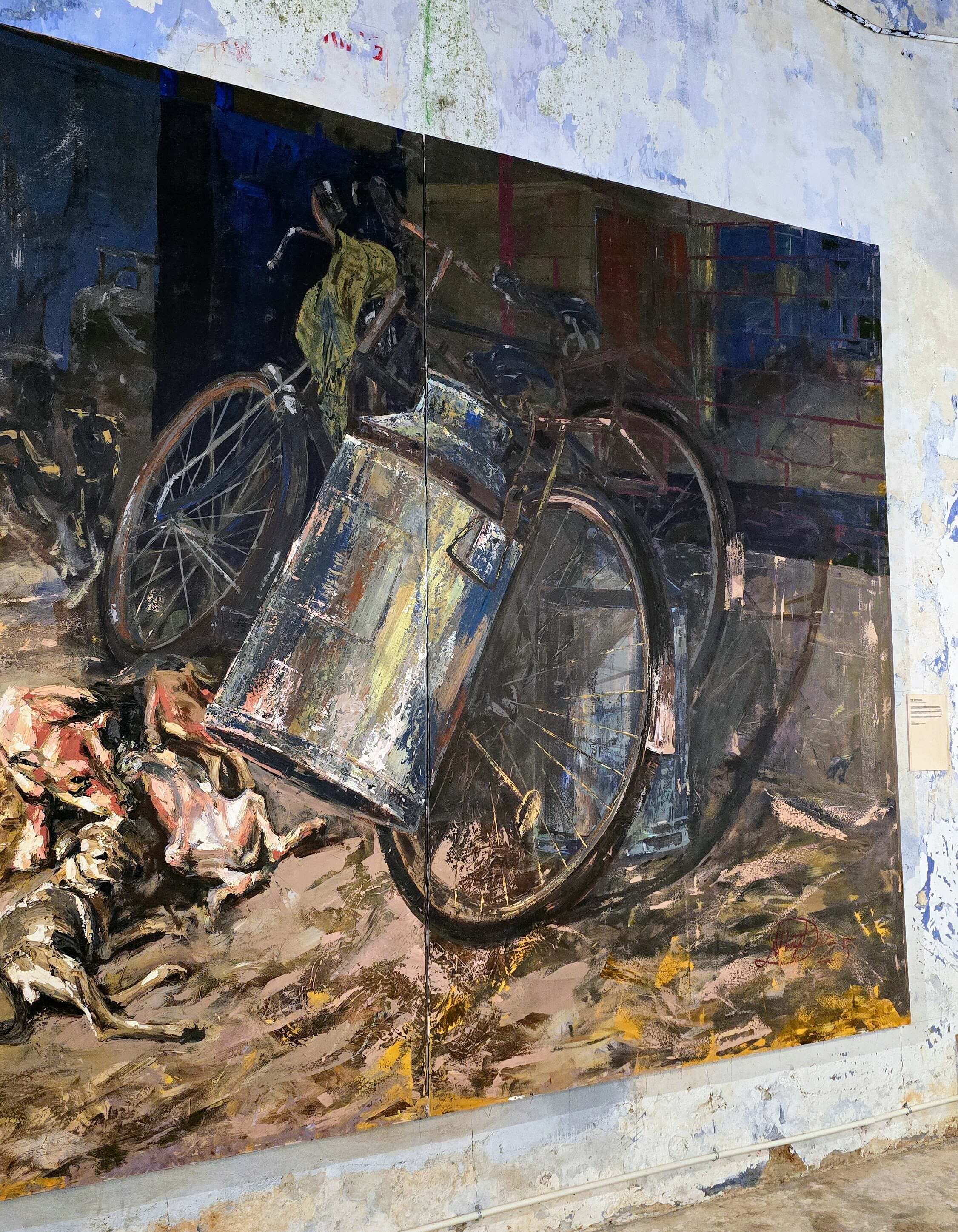 In his large-scale paintings, Abhijit observes the life of the bicycle, the humble two-wheeled 'friend of the poor', in his own words. From rural to urban spaces, the cycle becomes a mode of upliftment, traversing every terrain.