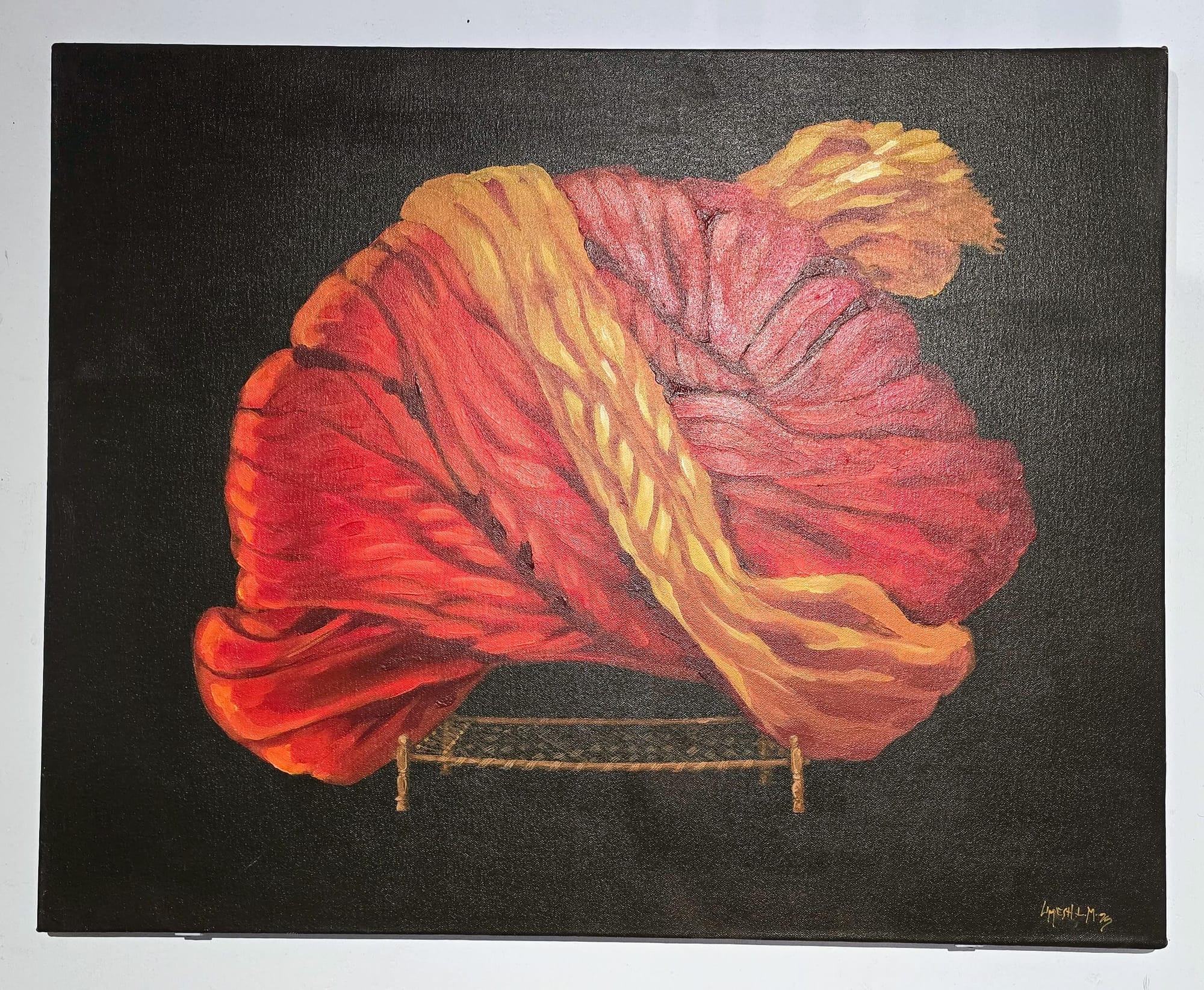 The Power of the Peta and Honour explore two objects that profoundly symbolize his farming background: the 'Peta' (a traditional headpiece or turban) and the 'Mancha' (a traditional rope bed).