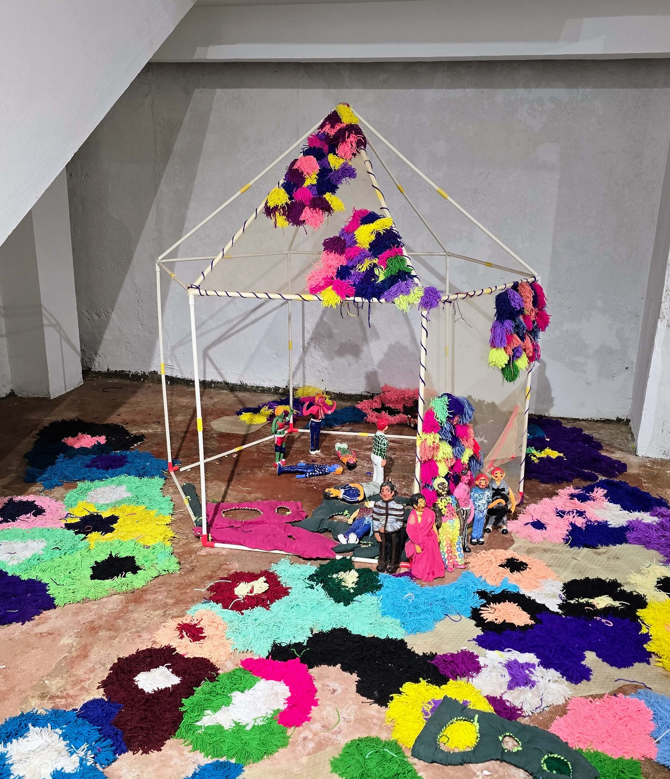 Mixed media installation fabric tents, painting-based photo prints, dolls, comic books, photobooks; Jute clothes, woolen thread, clay, paper-mâché, sketch books; Photographs and fabrics