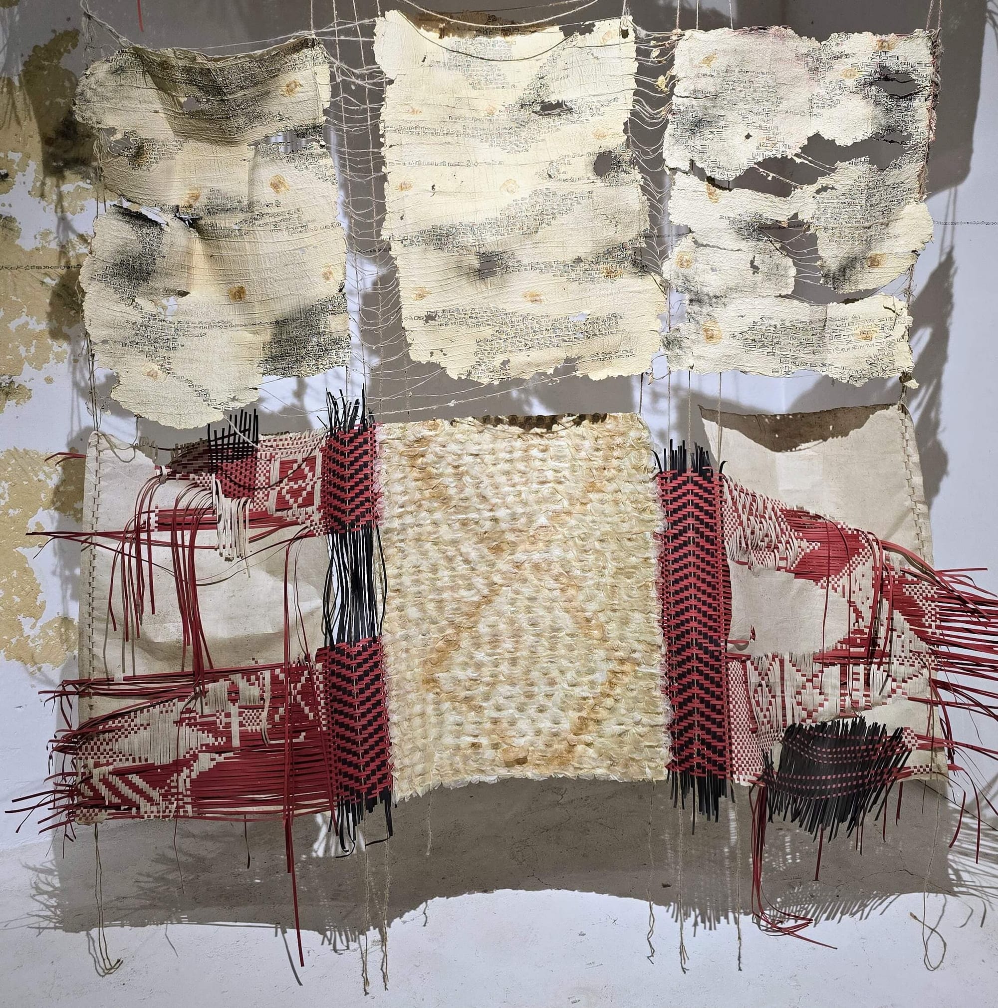 Weaving serves as the skeleton holding everything together. Traditional patterns gather fragmented parts, stitching them into provisional wholes. Scripts written with words once commonly heard are set against the dominance of other languages—highlighting linguistic disappearance while voicing urgent realities.