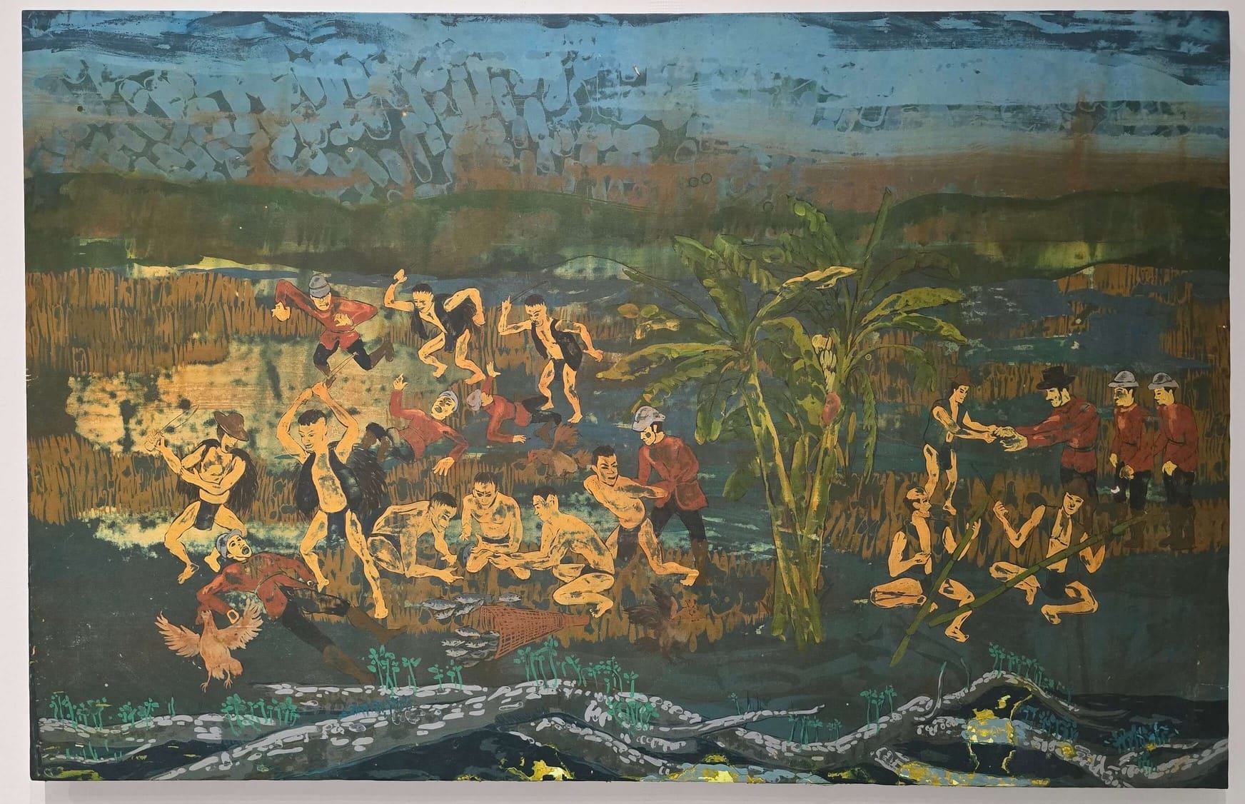Ejum Riba's two paintings tackle big questions through deeply personal lenses. Simulation examines how certain educational systems work to erase Indigenous cultures and local knowledge. It's a meditation on indoctrination—and what gets lost when we homogenise young minds.