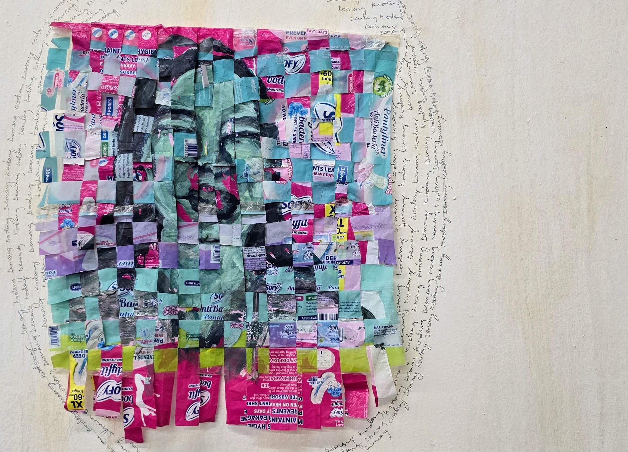 Medium: Mixed media — Embroidery on canvas, cloth, sanitary napkin, plastic/wrappers, paper
