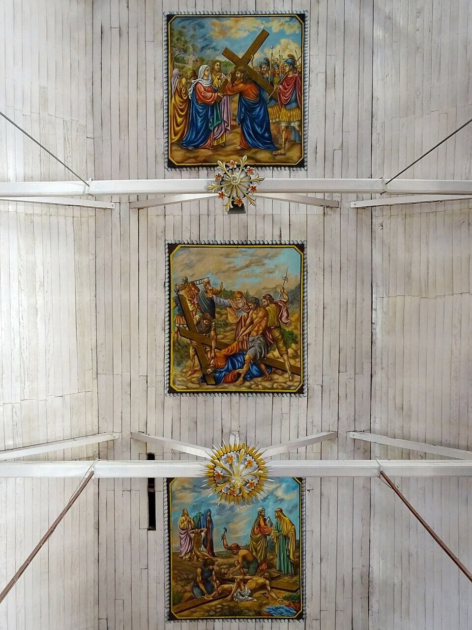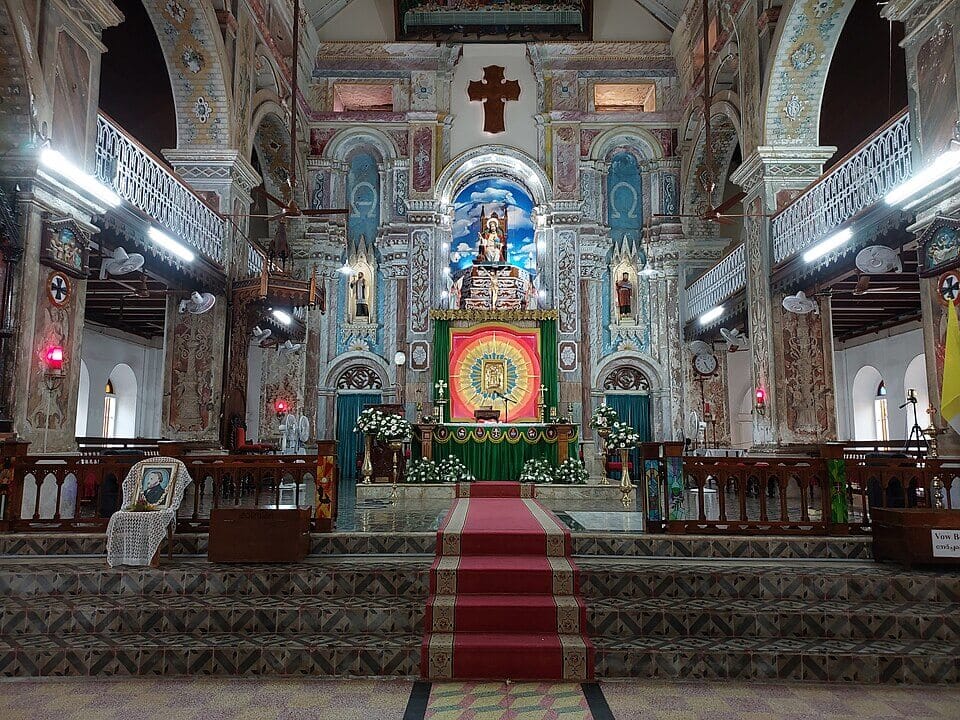 The white exterior gives no warning of what's inside. The interior is a wash of pastel colours, Gothic arches, and painted surfaces everywhere you look. Moscheni and his student Fr. De Gama of Mangalore painted frescoes on the columns, scenes from the Via Crucis on the ceiling, and seven large canvas paintings showing the passion and death of Christ.