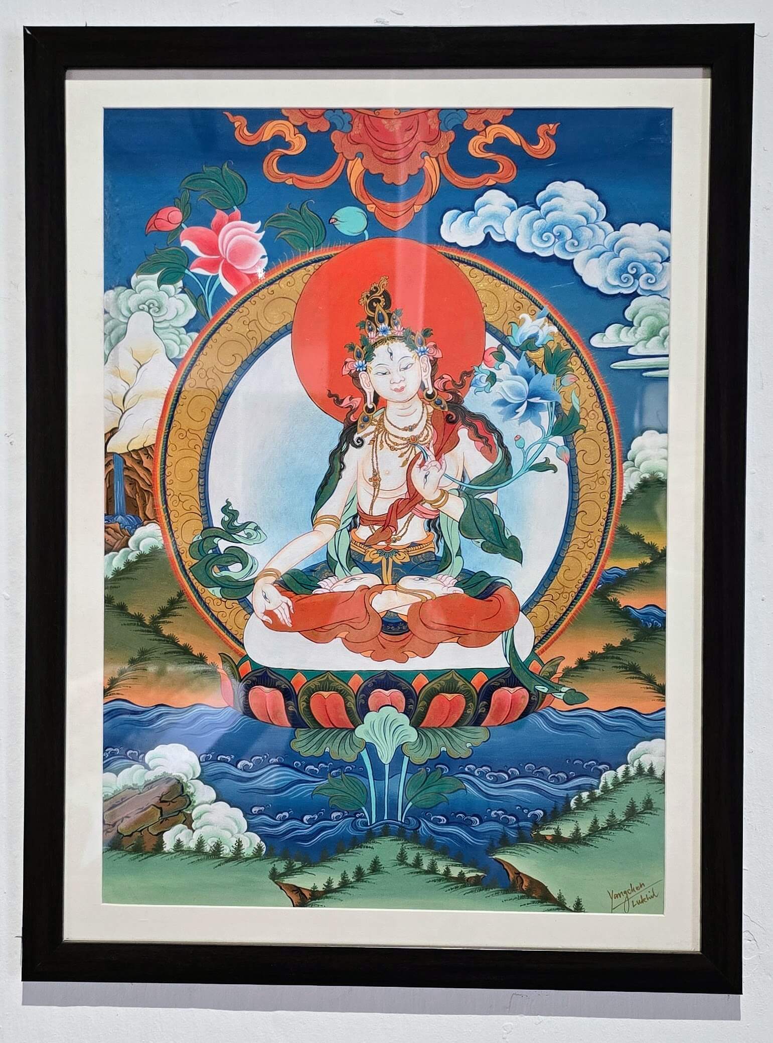 Working from the traditional lineage of Thangka—a form with sacred grammar often inseparable from spiritual and meditative practice—Yangchen brings contemporary touches while remaining rooted in tradition. She draws inspiration from local language and customs, presenting images of the female deities Dolkar (White Tara) and Jamyang (Manjushree).